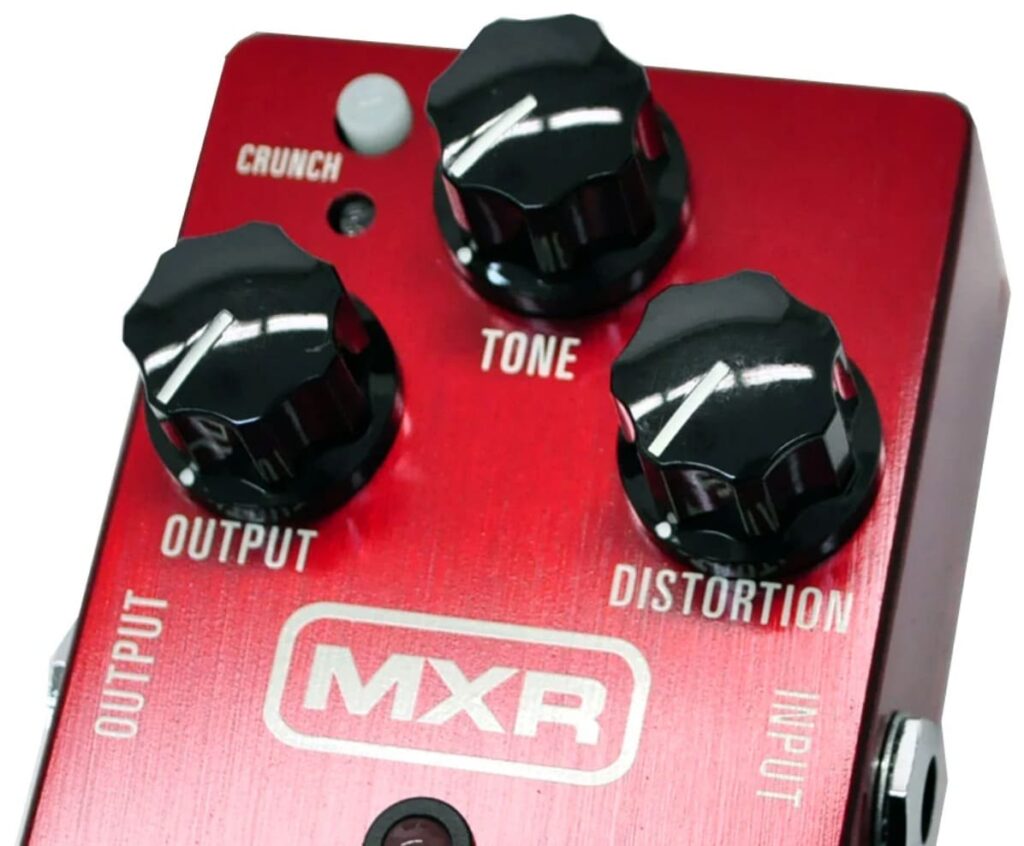 3つのブラックノブは適度な重みがあり、演奏中の微調整も容易です。中央の「CRUNCH」ボタンは青色LEDと共に作動し、視認性も抜群。この無駄のない、機能美に溢れたルックスこそがMXRのアイデンティティです。
